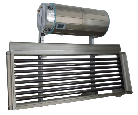 該產品室外太陽能集熱器部分采用注水式玻璃金屬套裝集熱管集熱器 ,其獨特的注水式結構